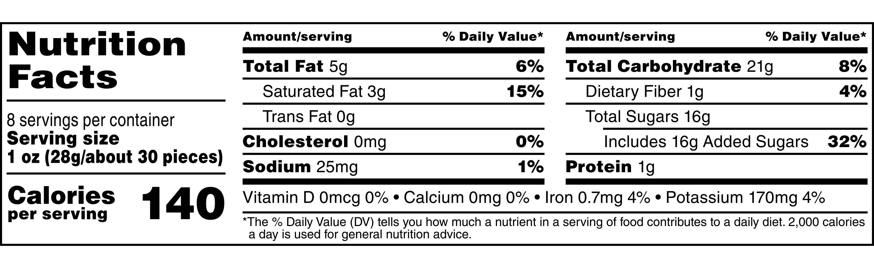 SEMISWEET CHOCOLATE (SUGAR, CHOCOLATE PROCESSED WITH ALKALI, CHOCOLATE, COCOA BUTTER, MILKFAT, SOY LECITHIN, NATURAL FLAVOR), SUGAR, COCOA CRISP RICE (RICE FLOUR, COCOA POWDER PROCESSED WITH ALKALI, SUGAR, BARLEY MALT EXTRACT, SALT, DEXTROSE, MIXED TOCOPHEROLS TO MAINTAIN FRESHNESS), LESS THAN 2% - CORNSTARCH, CORN SYRUP, DEXTRIN, COLORING (INCLUDES RED 40, YELLOW 6, YELLOW 5, BLUE 1, RED 40 LAKE, YELLOW 6 LAKE, YELLOW 5 LAKE, BLUE 1 LAKE, BLUE 2 LAKE, BLUE 2), CARNAUBA WAX, GUM ACACIA. Contains: ALLERGY INFORMATION: CONTAINS MILK AND SOY. MAY CONTAIN PEANUTS, TREE NUTS AND WHEAT.