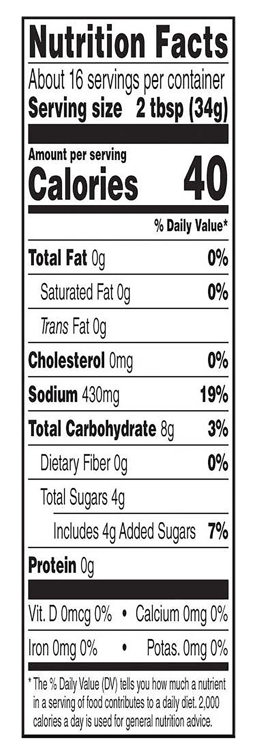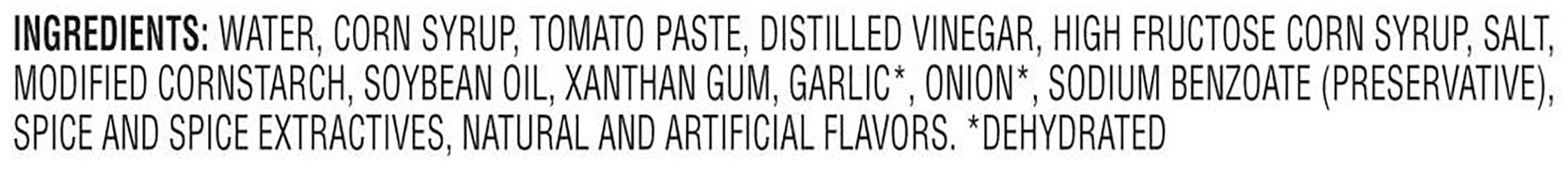 Water, Corn Syrup, Tomato Paste, Distilled Vinegar, High Fructose Corn Syrup, Salt, Modified Cornstarch, Soybean Oil, Xanthan Gum, Garlic (Dehydrated), Onion (Dehydrated), Sodium Benzoate (Preservative), Spice and Spice Extractives, Natural and Artificial Flavors Contains: Soybeans