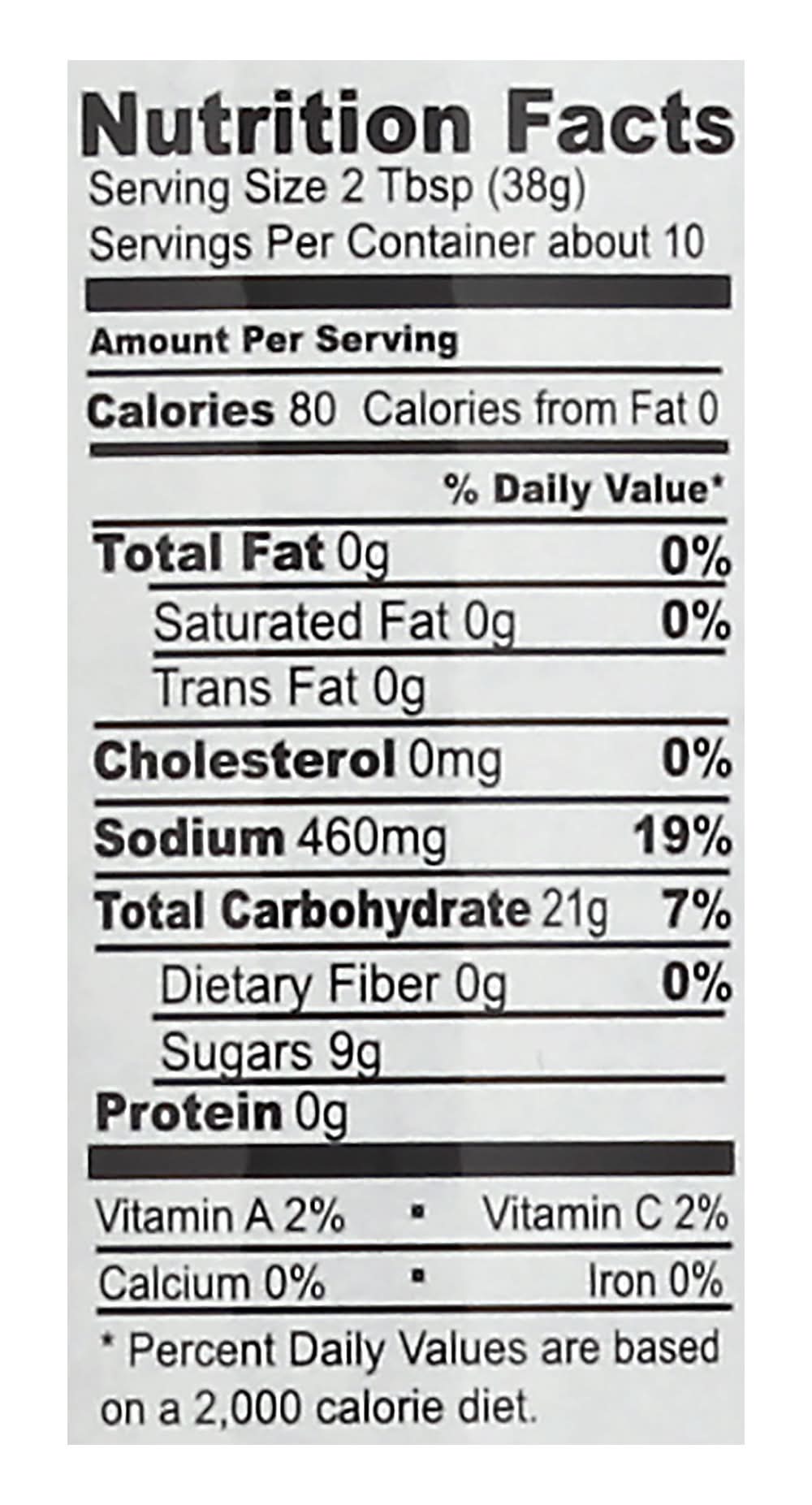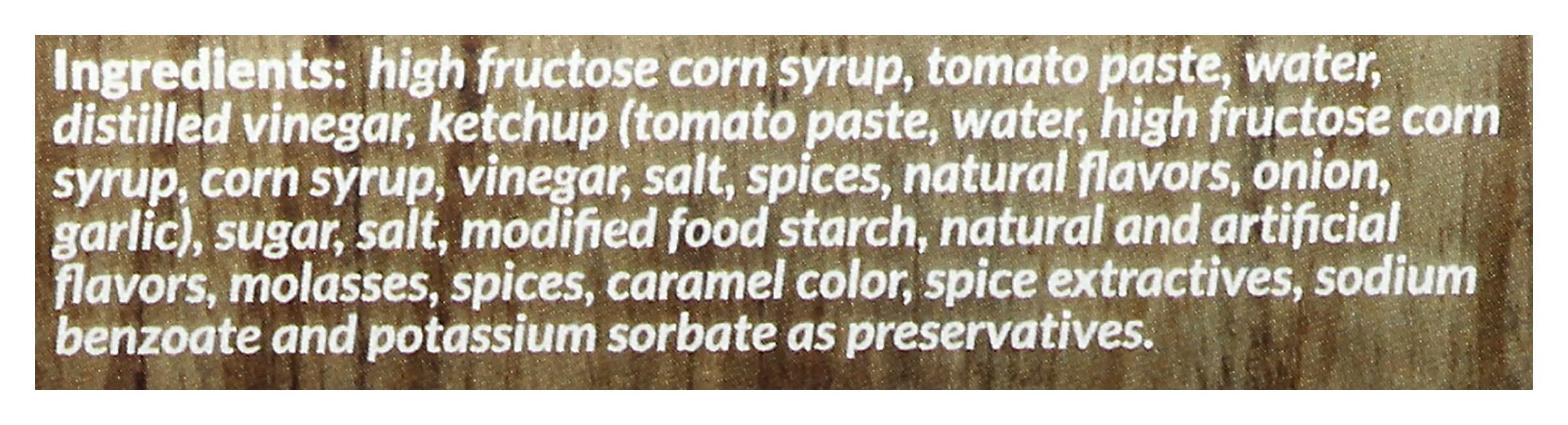 High Fructose Corn Syrup, Tomato Paste, Water, Distilled Vinegar, Ketchup (Tomato Paste, Water, High Fructose Corn Syrup, Corn Syrup, Vinegar, Salt, Spices, Natural Flavors, Onion, Garlic), Sugar, Salt, Modified Food Starch, Natural and Artificial Flavors, Molasses, Spices, Caramel Color, Spice Extractives, Sodium Benzoate and Potassium Sorbate as Preservatives