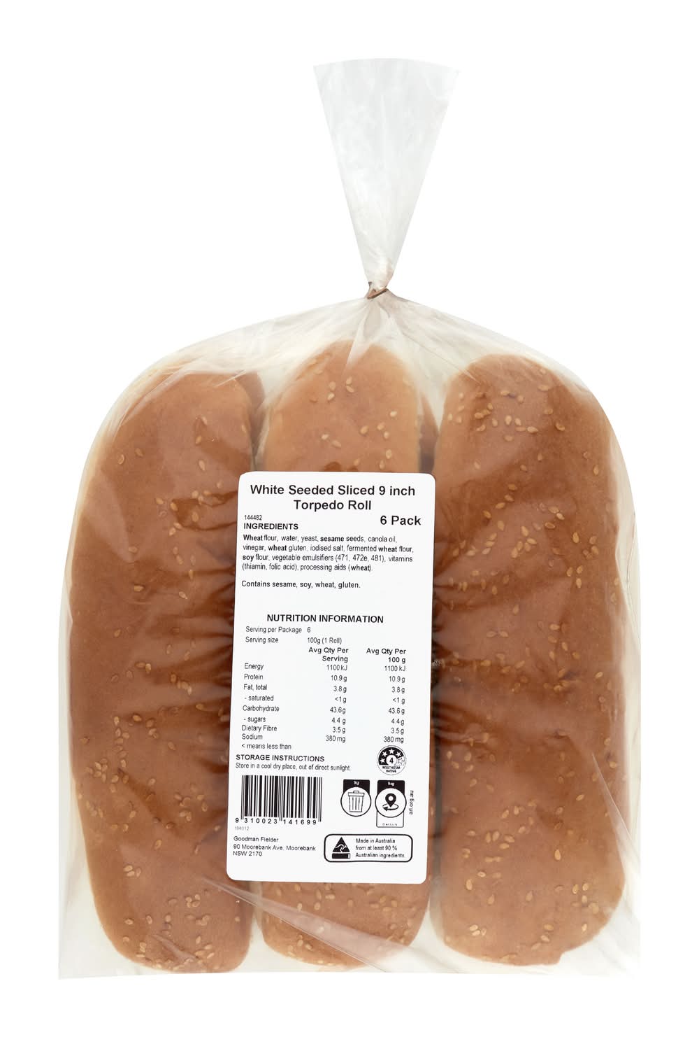 White Seeded Sliced Torpedo Rolls, 9 in (600g, 6 pack)
