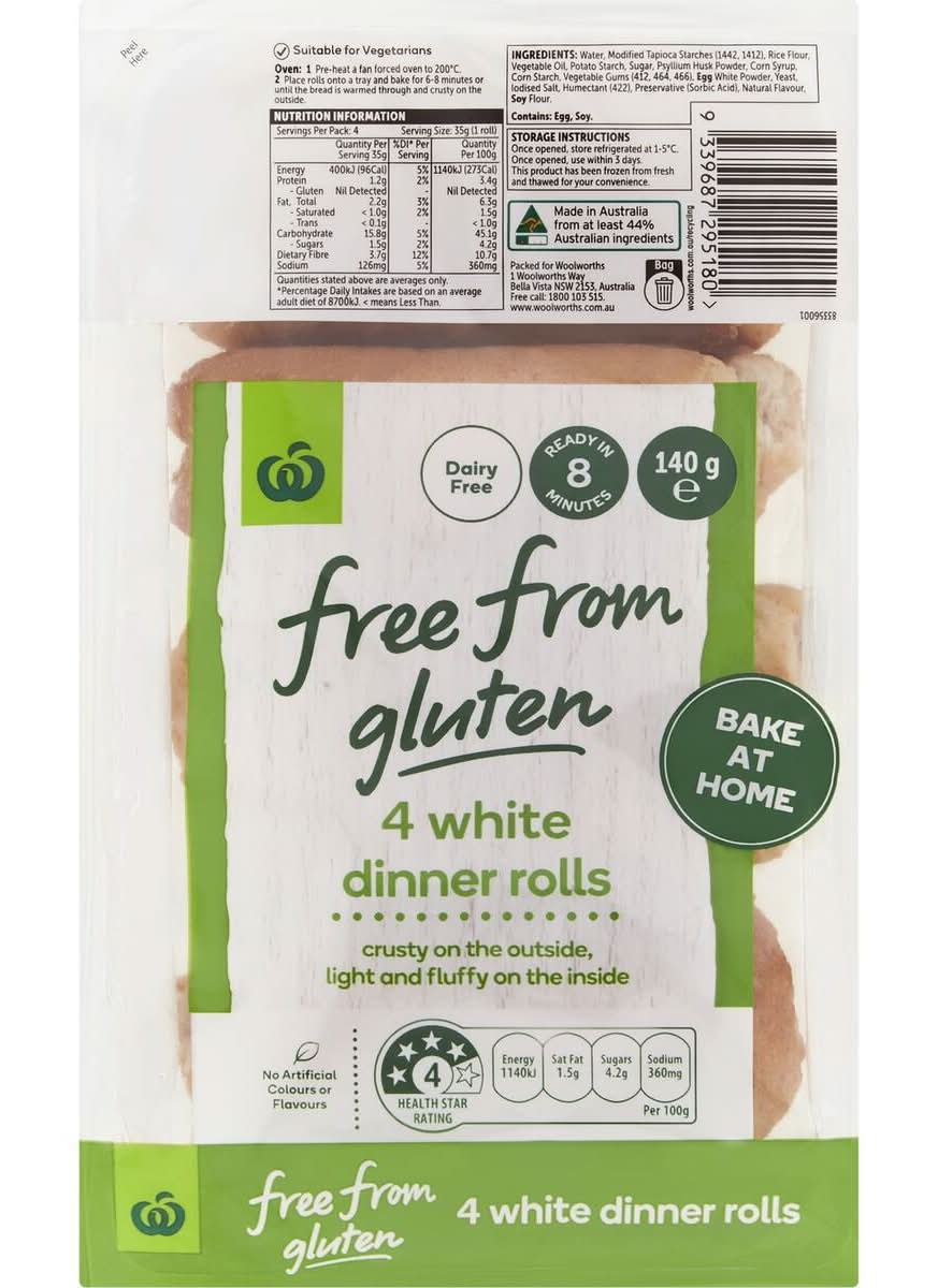 Woolworths Free From Gluten Bake At Home White Dinner Rolls (140g, 4 pack)