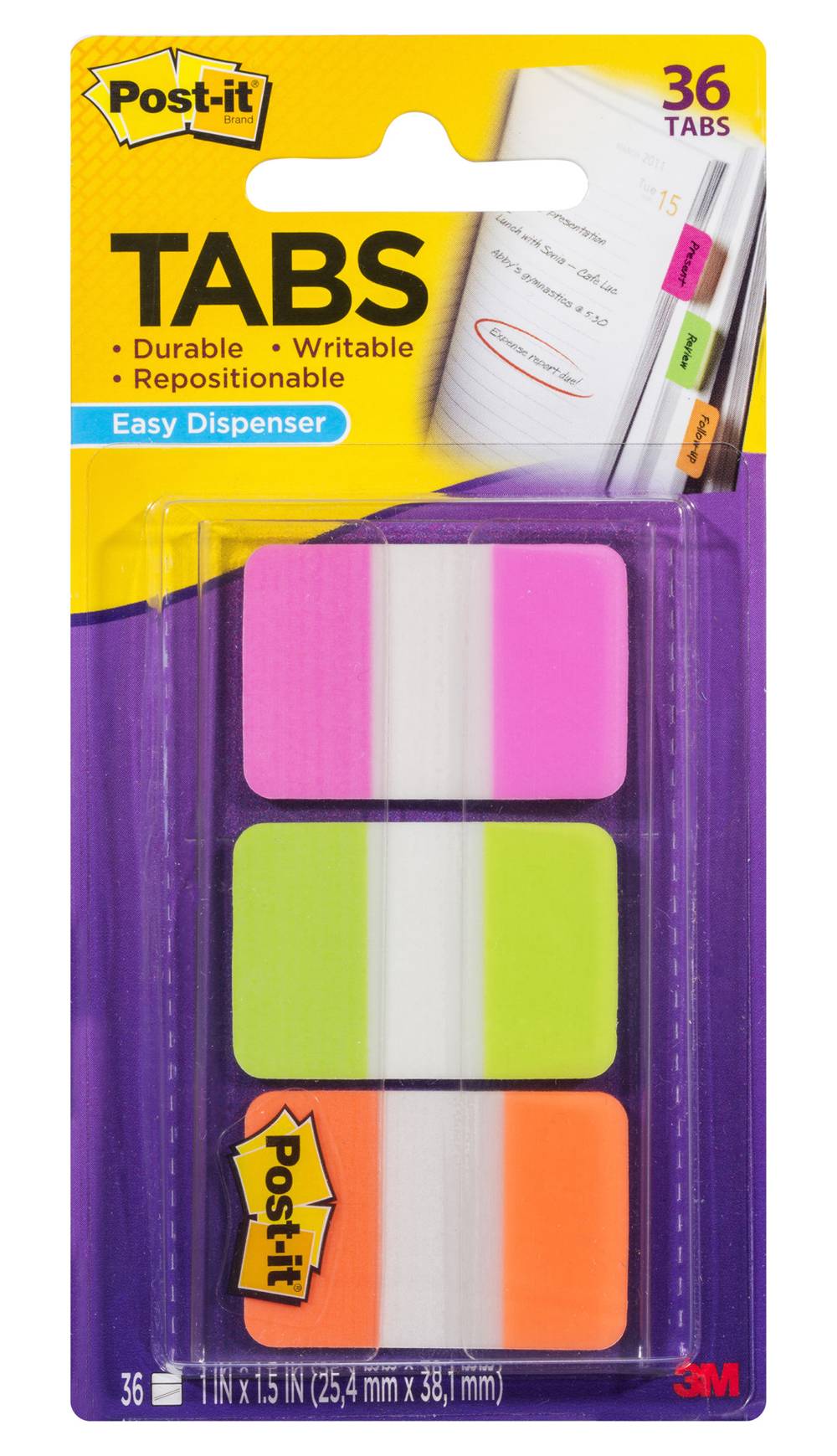Post-It Tabs, 1x1.5 in, Pink-Green-Orange (36 pack)
