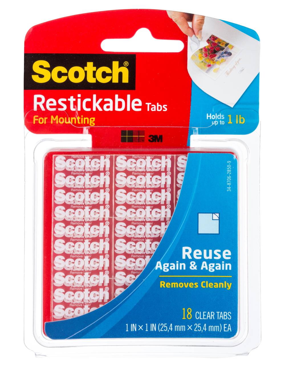Scotch Restickable Mounting Tabs, 1x1 in, Clear (18 pack)