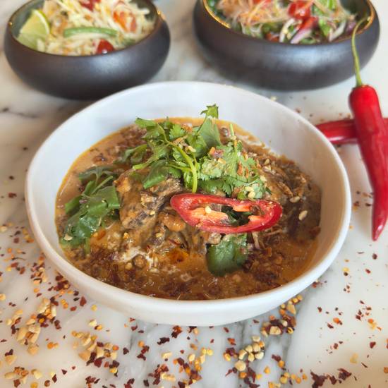 A rich & earthy curry w/ slow cooked fall apart beef cheek, roasted new potatoes, shallots, peanuts, fresh chilli & Thai eggplant ~ 🌶, GF, 🐟, 🥜