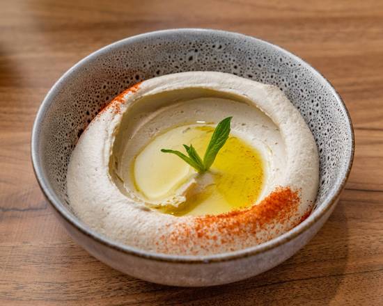 Blended chickpeas with tahini and lemon dressed with olive oil