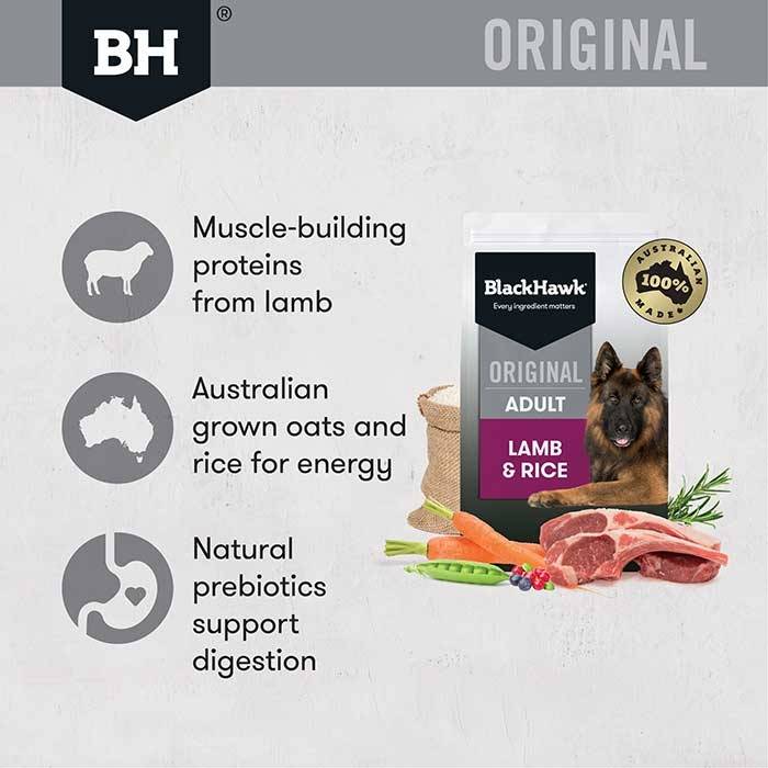 Black Hawk Lamb & Rice Holistic Adult Formula is designed to meet the AAFCO standards for growth and maintenance of dogs, which ensures your pet has the correct nutrients, vitamins and minerals. This formula includes blueberries - known to have natural antioxidant properties; dandelion - rich in magnesium, potassium and calcium; and rosemary - can assist with new hair growth and may reduce bad breath. Black Hawk Lamb & Rice Adult Formula is high in energy, protein and fat, and is suitable for small to large breed dogs. It is ideal for all life stages. Lamb is easily digested, therefore a great diet for dogs with sensitive stomachs. Often used by working dogs, greyhounds, sled dogs, agility etc. Made in Australia. Ingredients Lamb Meal, Ground Brown Rice, Ground Oats, Chicken Fat (preserved with mixed Tocopherols source of Vit E, Citric Acid Rosemary extract), Rye, Flaxseed Meal, Fish Meal, Emu Oil, Dried Carrots, Dried Kelp, Choline Chloride, Potassium Chloride, Chicory, Yucca Schidigera Extract, Glucosamine, Chondroitin Sulphate, Dried Blueberries, Dandelion, Peppermint, Rosemary, Tomato Meal, Zinc Oxide, Zinc Amino Acid Chelate, Iron Sulphate, Vitamin A-Acetate, Vitamin D3 Supplement, Manganous Oxide, Vitamin E Supplement, Vitamin B12 Supplement, Copper Sulphate, Manganese Amino Acid Chelate, Copper Amino Acid Chelate, Riboflavin, Niacin, Calcium Pantothenate, Folic Acid, Pyridoxine Hydrochloride, Thiamine Mononitrate, D-Biotin, Calcium Iodate, Sodium Selenite, Cobalt Carbonate. Size: 20 kg