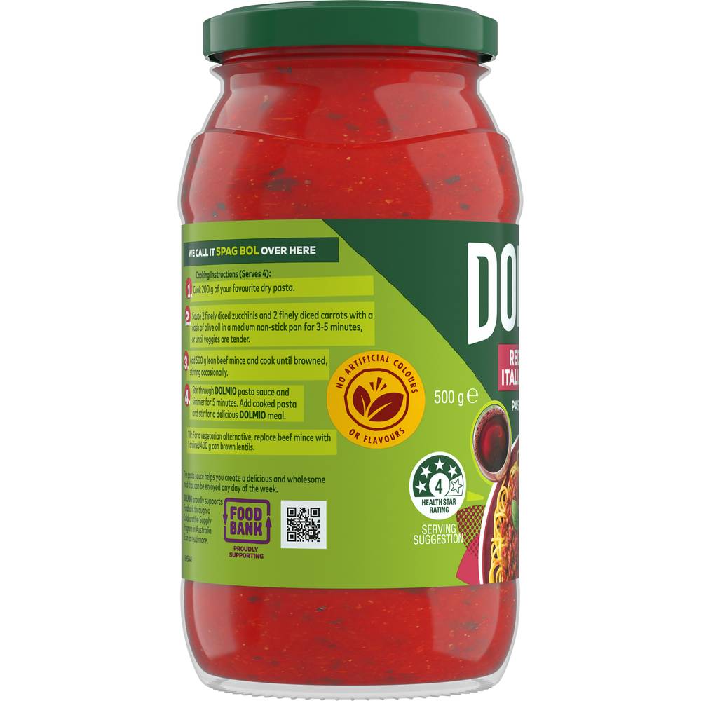 Directions for use: Cook 200 g of your favourite dry pasta. Saute 2 finely diced zucchinis and 2 peeled and finely diced carrots with a dash of olive oil in a medium non-stick pan for 3-5 minutes, or until veggies are tender. Add 500 g lean beef mince and cook until evenly browned, stirring occasionally. Stir through DOLMIO pasta sauce and simmer for 5 minutes. Serve over pasta for a delicious DOLMIO meal. For more healthy recipe inspiration Storage recommendation: Refrigerate after opening. Use within 3 days. Jar not suitable for microwave.
