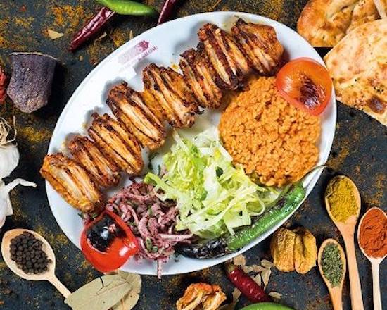 Fresh chicken garlic grilled over a wood fire, served with bulgur rice and salad