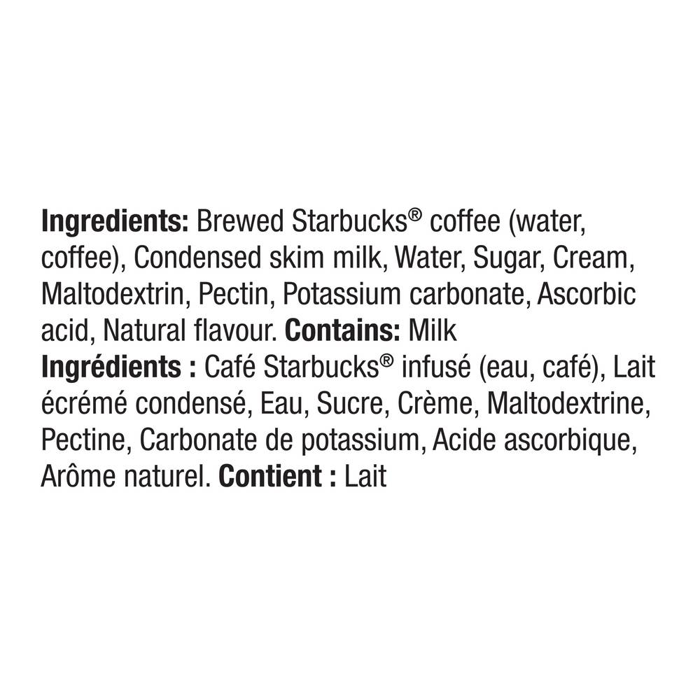Ingrédients: BREWED STARBUCKS COFFEE (COFFEE, WATER, SUGAR, CONDENSED SKIM MILK, CREAM, MALTODEXTRIN, NATURAL AND ARTIFICIAL FLAVOURS, PECTIN, POTASSIUM CARBONATE, ASCORBIC ACID.