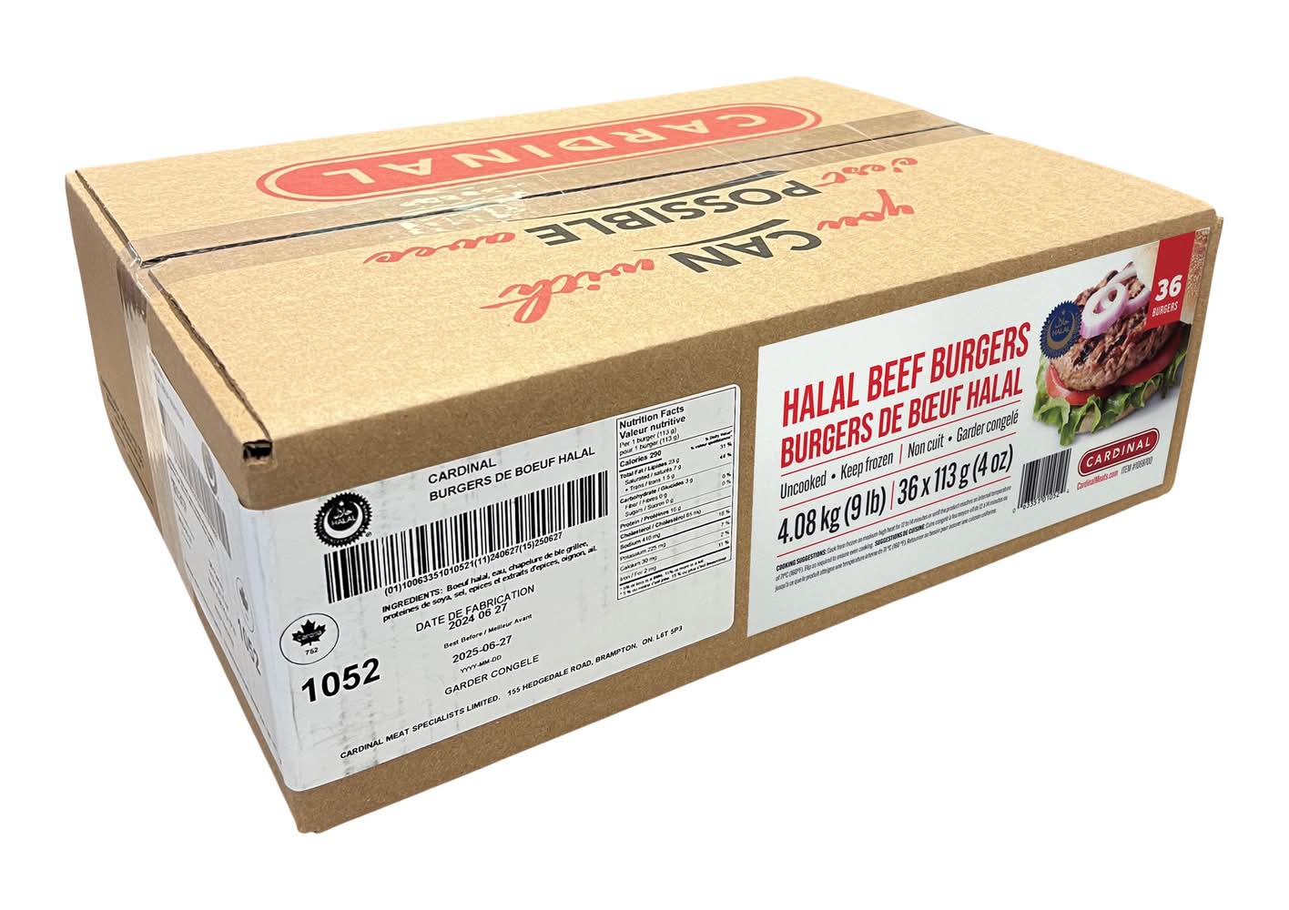 Cardinal - Hamburgers De Boeuf Halal Surgelés, 36 × 113 G / Cardinal Halal Frozen Beef Burgers, 36 × 113 G