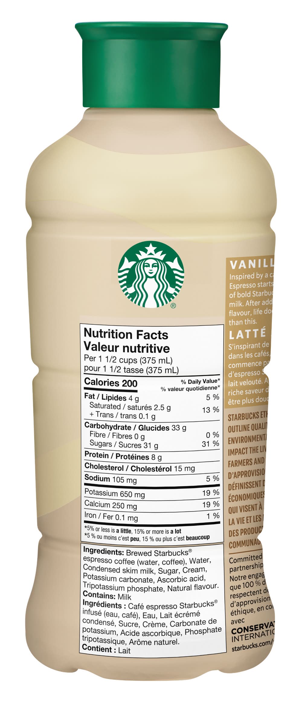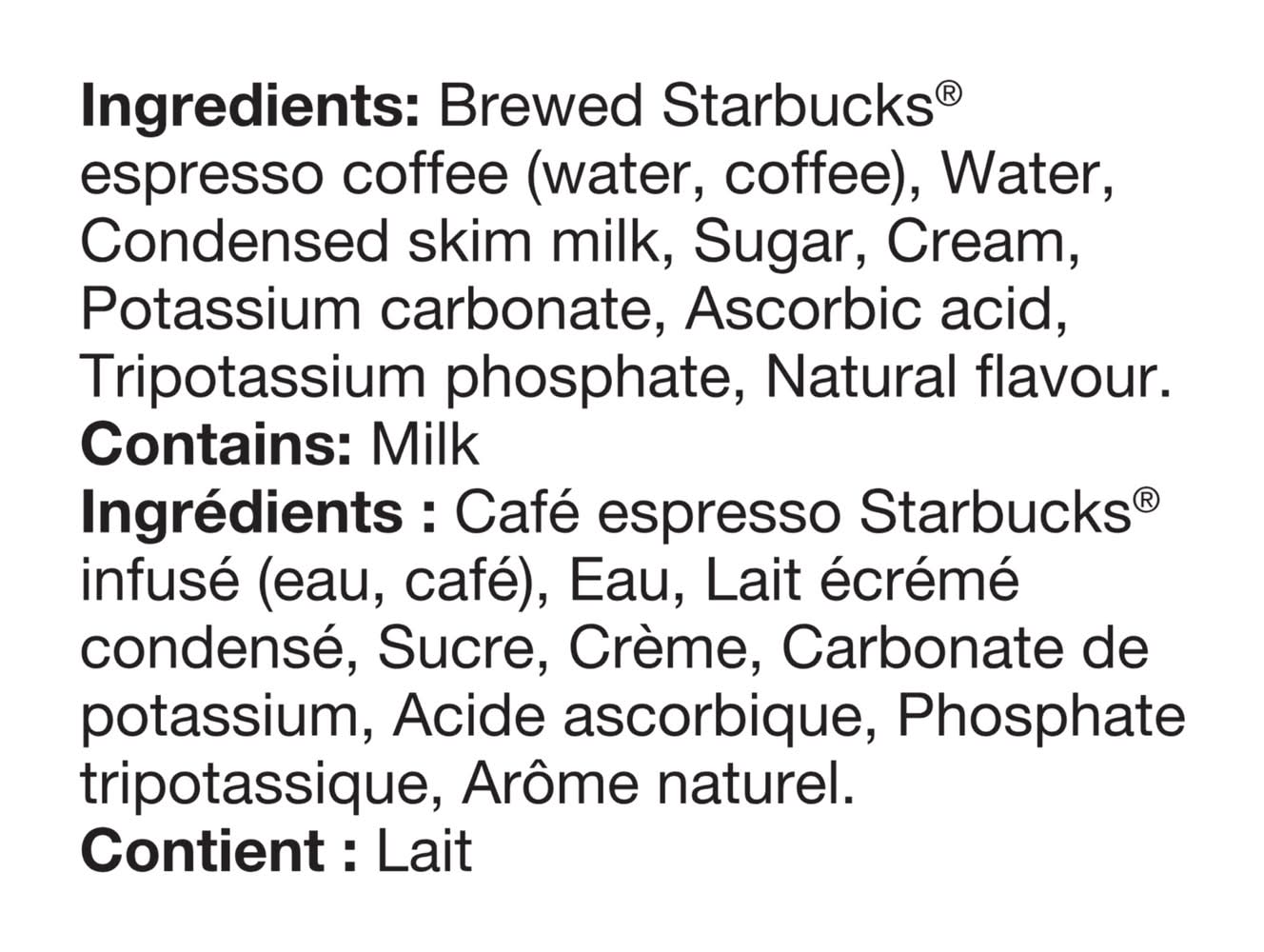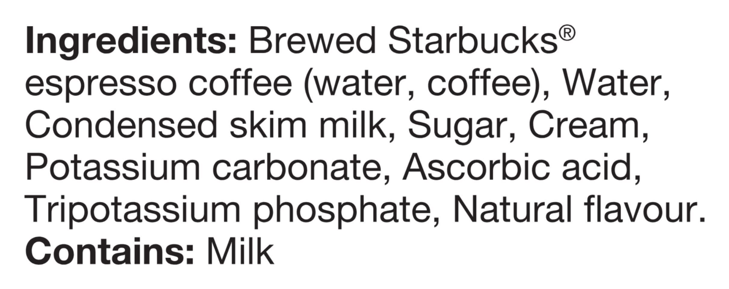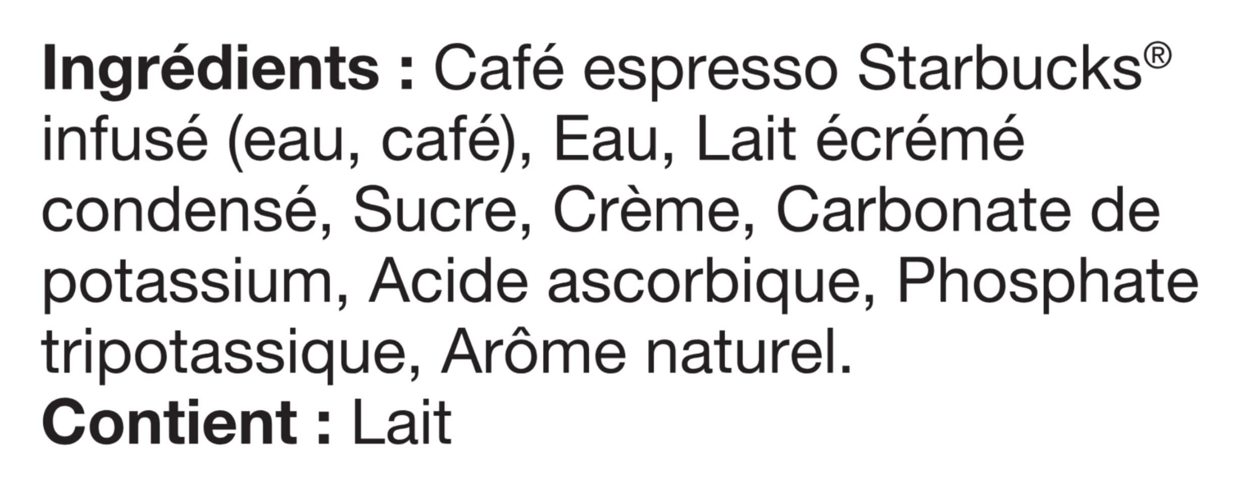 Ingrédients: Brewed Starbucks® Espresso Coffee (Water, Coffee), Water, Condensed Skim Milk, Sugar, Cream, Natural Flavour, Potassium Carbonate, Ascorbic Acid, Tripotassium Phosphate. Contient: CONTAINS: MILK
