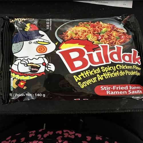 Nouilles sautées épicées au poulet frit avec des graines de sésame croquantes et de la poudre d'algues grillées savoureuse. Spicy fried chicken-flavored stir-fried noodles with crunchy sesame seeds and savory roasted seaweed powder Ce produit est assujetti à des taxes.