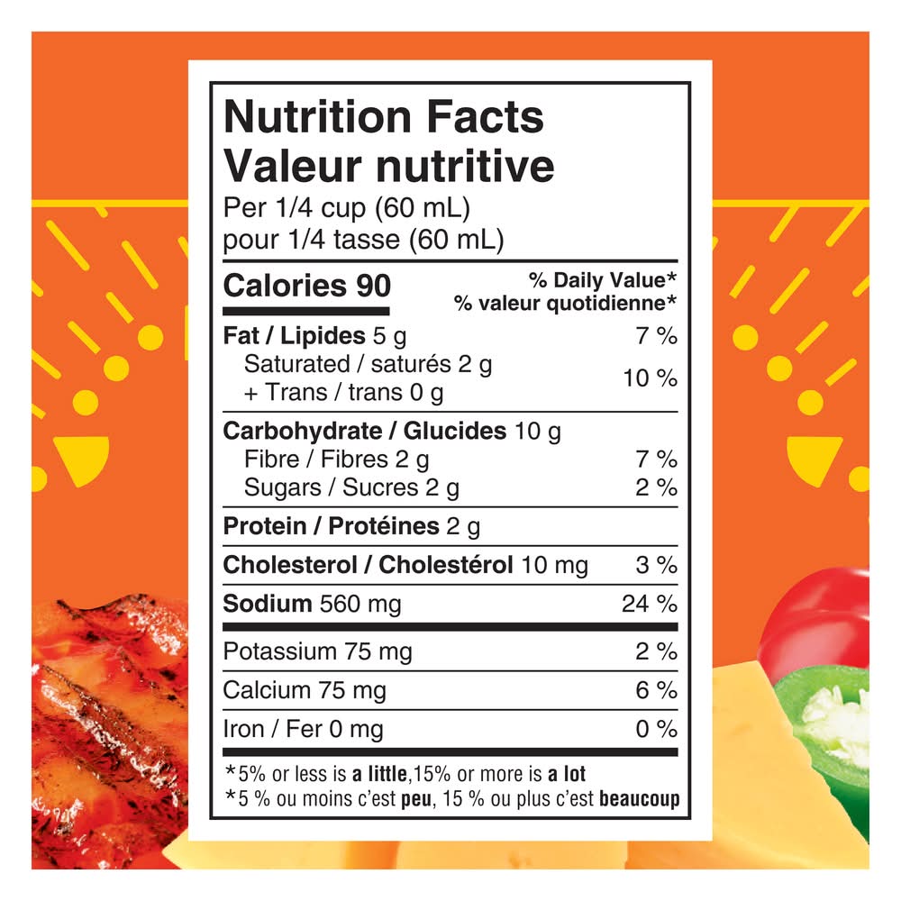 When you want a creamy dip to elevate your snack spread, try Tostitos Salsa Con Queso. Made with real milk and cheese, this indulgent dip gives snack time a rich and delicious upgrade. With a flavourful blend of Monterey Jack cheese, jalapeño peppers, chili peppers and more, it's a tasty complement to Tostitos tortilla chips. This dip is perfect for cheese and salsa lovers looking to kick up the flavour with a velvety, satisfying dip. Whether you're enjoying a night in with your family, watching the game, or treating yourself to a creamy and crunchy snack, Tostitos Salsa Con Queso makes the moment special.br PepsiCo Frito-Lay Canada, P.O. BOX 40, Cambridge, Ontario N1R 5S9
