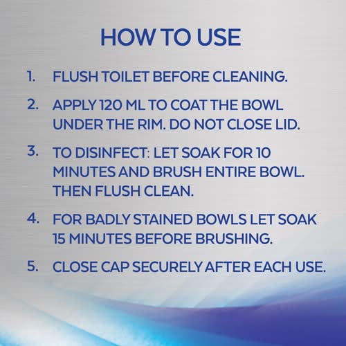 Ensures a thorough clean by coating areas above and below the waterline. Its viscous formulation clings to stains to enhance cleaning effectiveness. Designed with an angled bottle, the cleaner easily reaches difficult areas, especially under the rim, providing a comprehensive clean and leaving the toilet bowl both deodorized and disinfected.