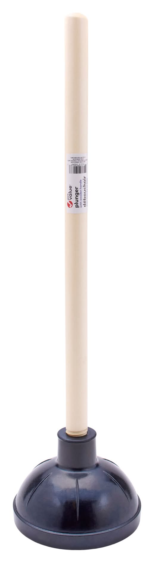 Plunger with wooden handle Black rubber finish Useful for removing clogs with minimal spillage