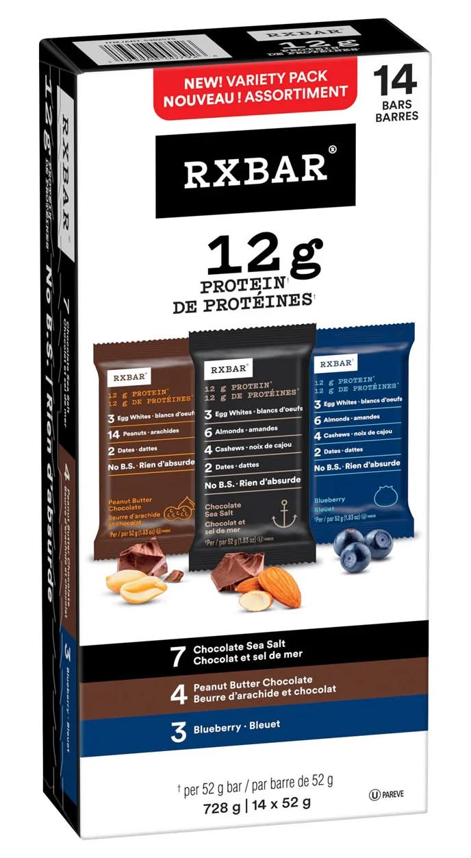 RXBAR Protein Bars Variety pack, Chocolate Sea Salt-Peanut Butter Chocolate-Blueberry (14 x 52 g)
