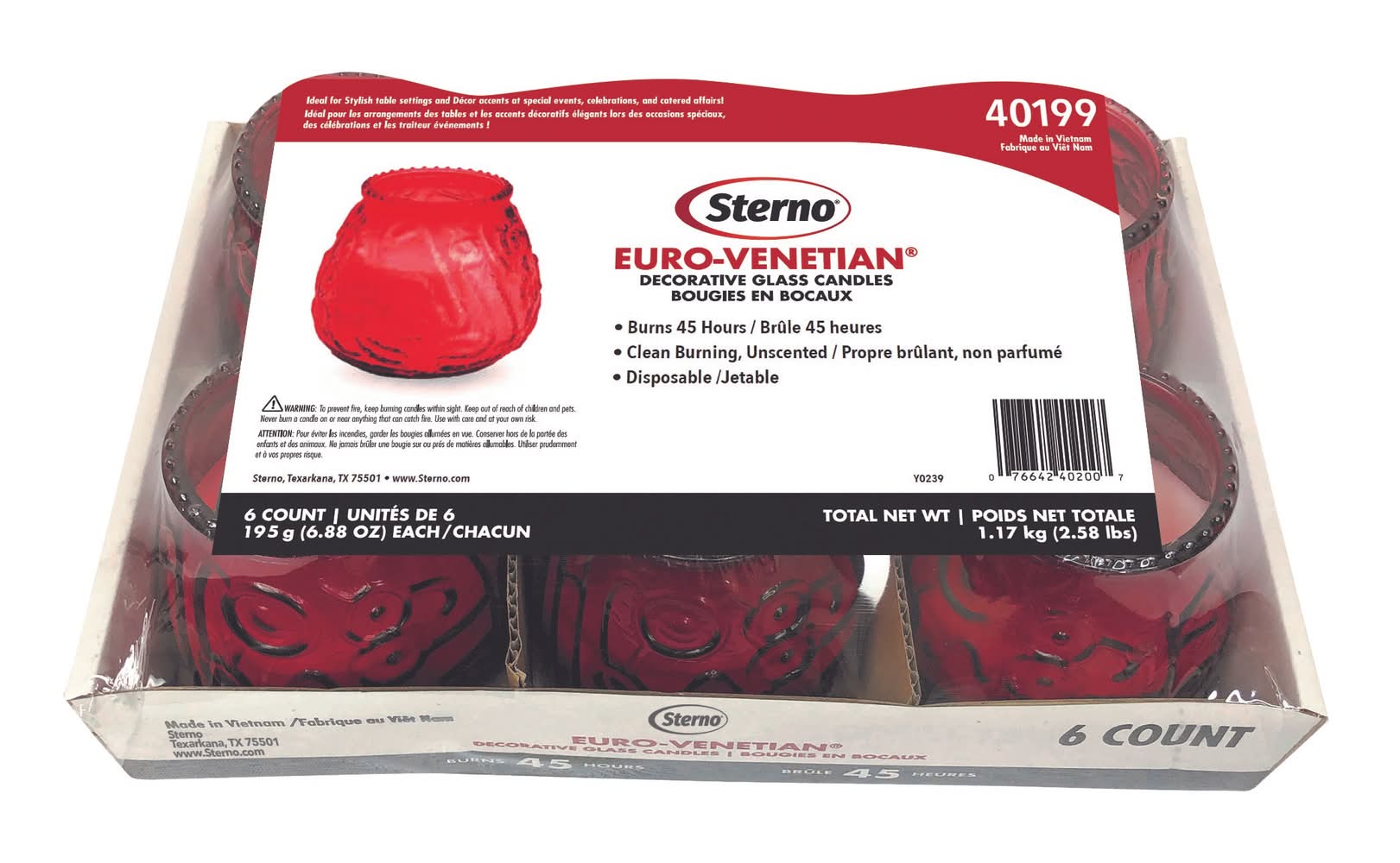 Sterno Euro-Venetian Decorative Glass Candles, Red (6 x 195 g)