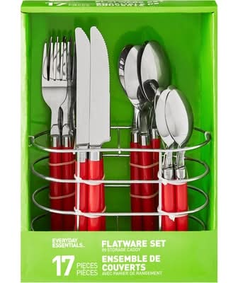 Everyday Essentials Flatware Set in Storage Caddy, Red (17 ct)