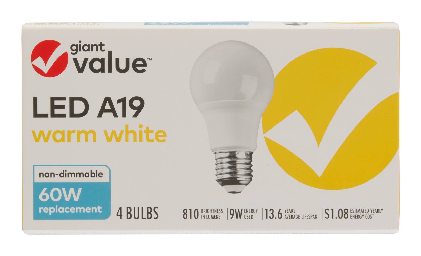 Giant Value Led A19 Light Bulbs 60 Watt, Warm White (4 ct)