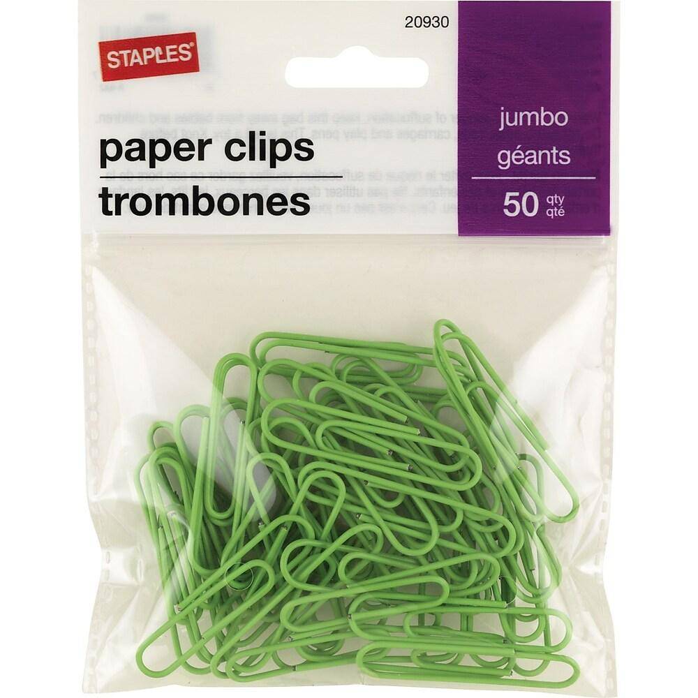 Staples Jumbo Vinyl-Coated Paper Clips, Green, 50/pack