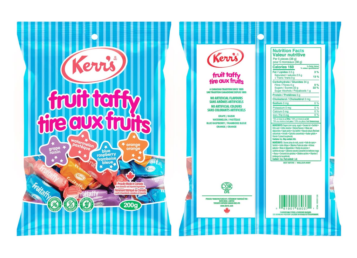 KERR'S Fruit Taffy Candy, Grape-Watermelon-Blue Raspberry-Orange (200 g)