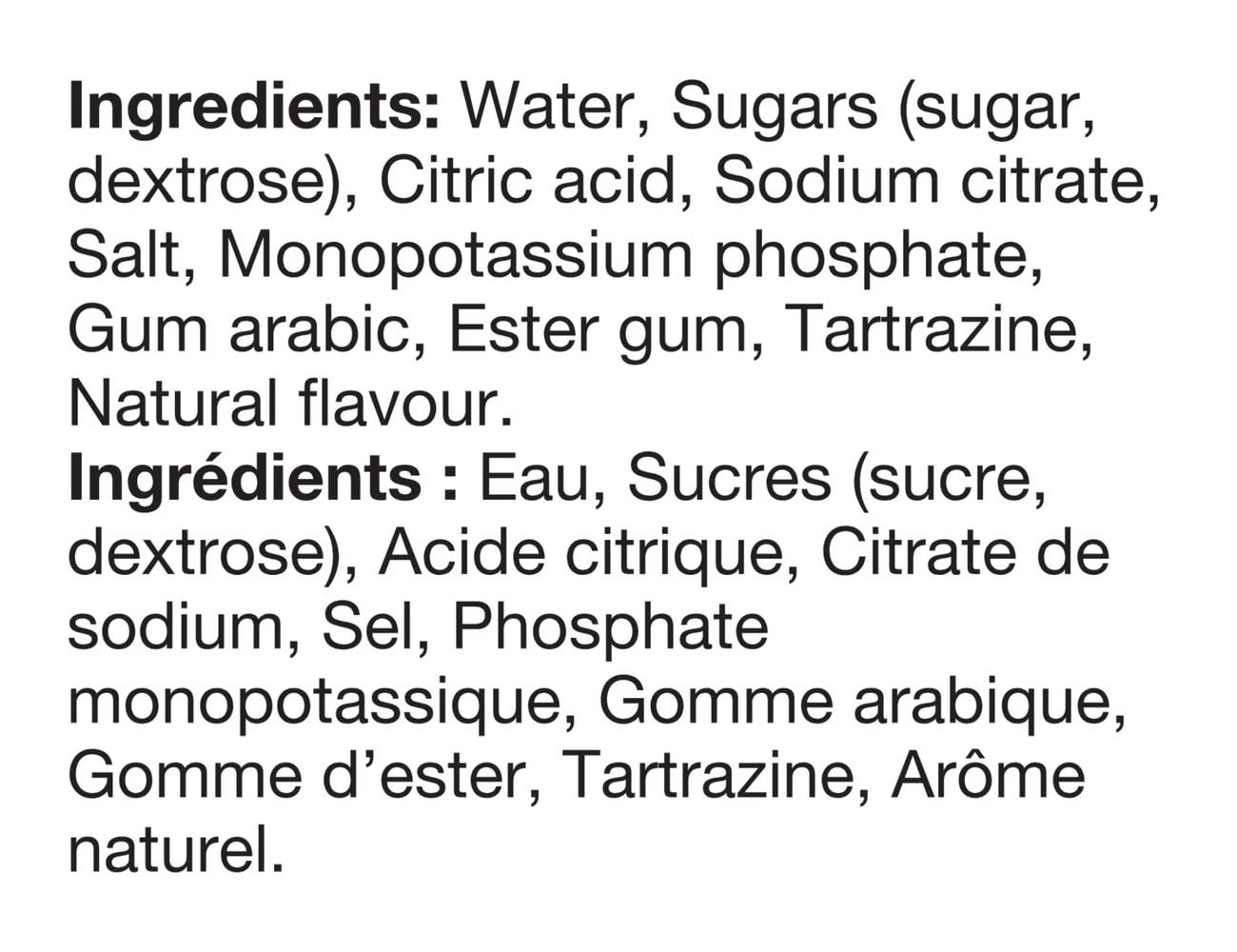 Ingredients: WATER, SUGAR, DEXTROSE, CITRIC ACID, NATURAL FLAVOURS, SALT, SODIUM CITRATE, MONOPOTASSIUM PHOSPHATE, GUM ARABIC, ESTER GUM, COLOUR.