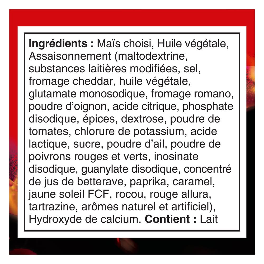 Ingredients: Selected Corn, Vegetable Oil, Seasoning (Maltodextrin, Modified Milk Ingredients, Salt, Cheddar Cheese, Vegetable Oil, Monosodium Glutamate, Romano Cheese, Onion Powder, Citric Acid, Disodium Phosphate, Spices, Dextrose, Tomato Powder, Potassium Chloride, Lactic Acid, Sugar, Garlic Powder, Red And Green Bell Pepper Powder, Disodium Inosinate, Disodium Guanylate, Beet Juice Concentrate, Paprika, Caramel, Sunset Yellow Fcf, Annatto, Allura Red, Tartrazine, Natural And Artificial Flavour), Calcium Hydroxide. Contains Milk Ingredients. Contains: Milk