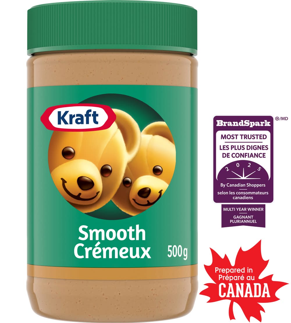 A family favourite and a Canadian classic, Kraft Smooth Peanut Butter is perfect for the whole family. Made with high-quality dry roasted peanuts, Kraft Peanut Butter has a delicious creamy and nutty taste. Try our peanut butter in your favourite PB&J sandwich or spread on crunchy toast. You can even dip vegetables in our peanut butter. Each 500 g jar of smooth peanut butter comes in a recloseable jar to preserve freshness.