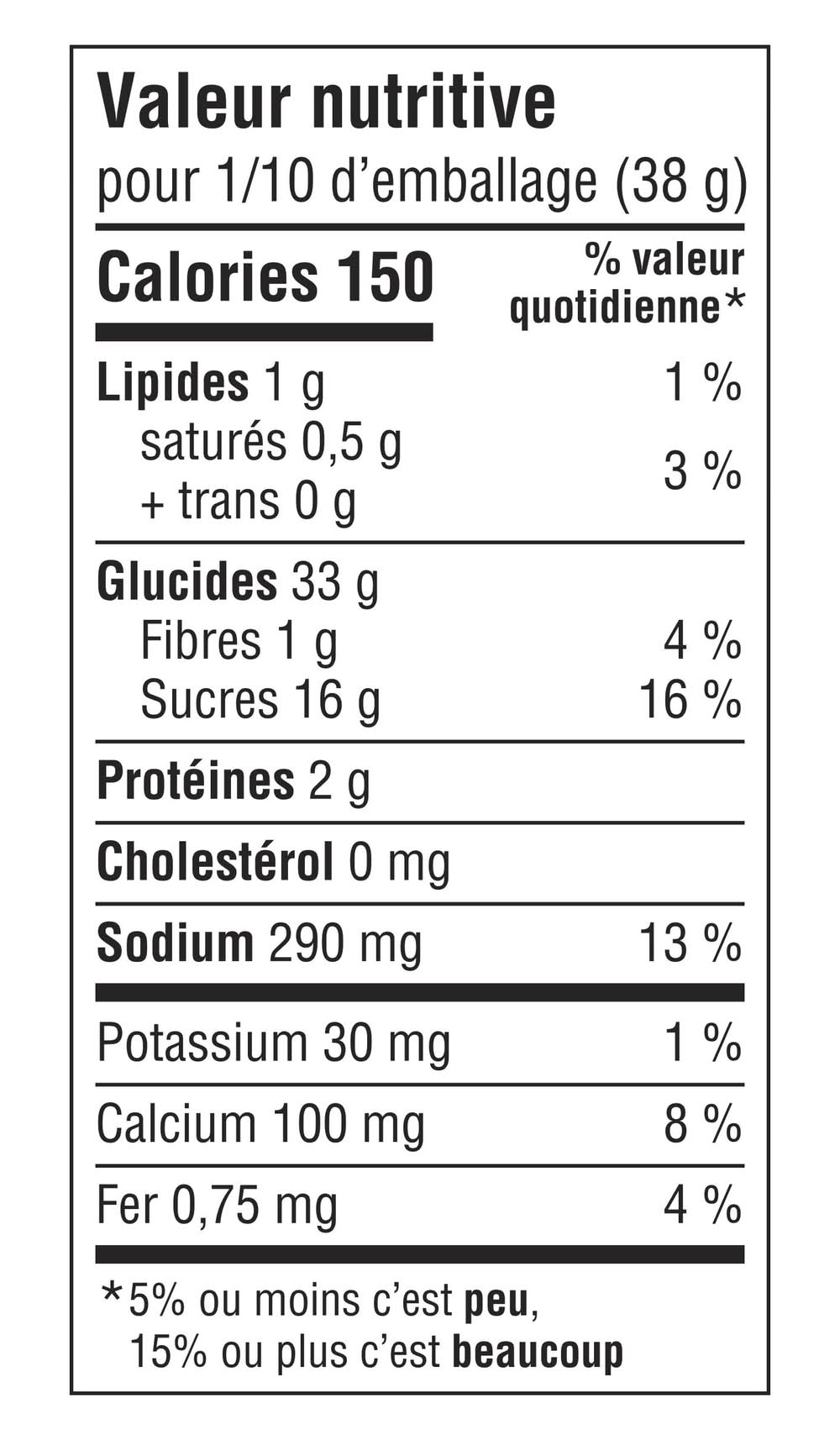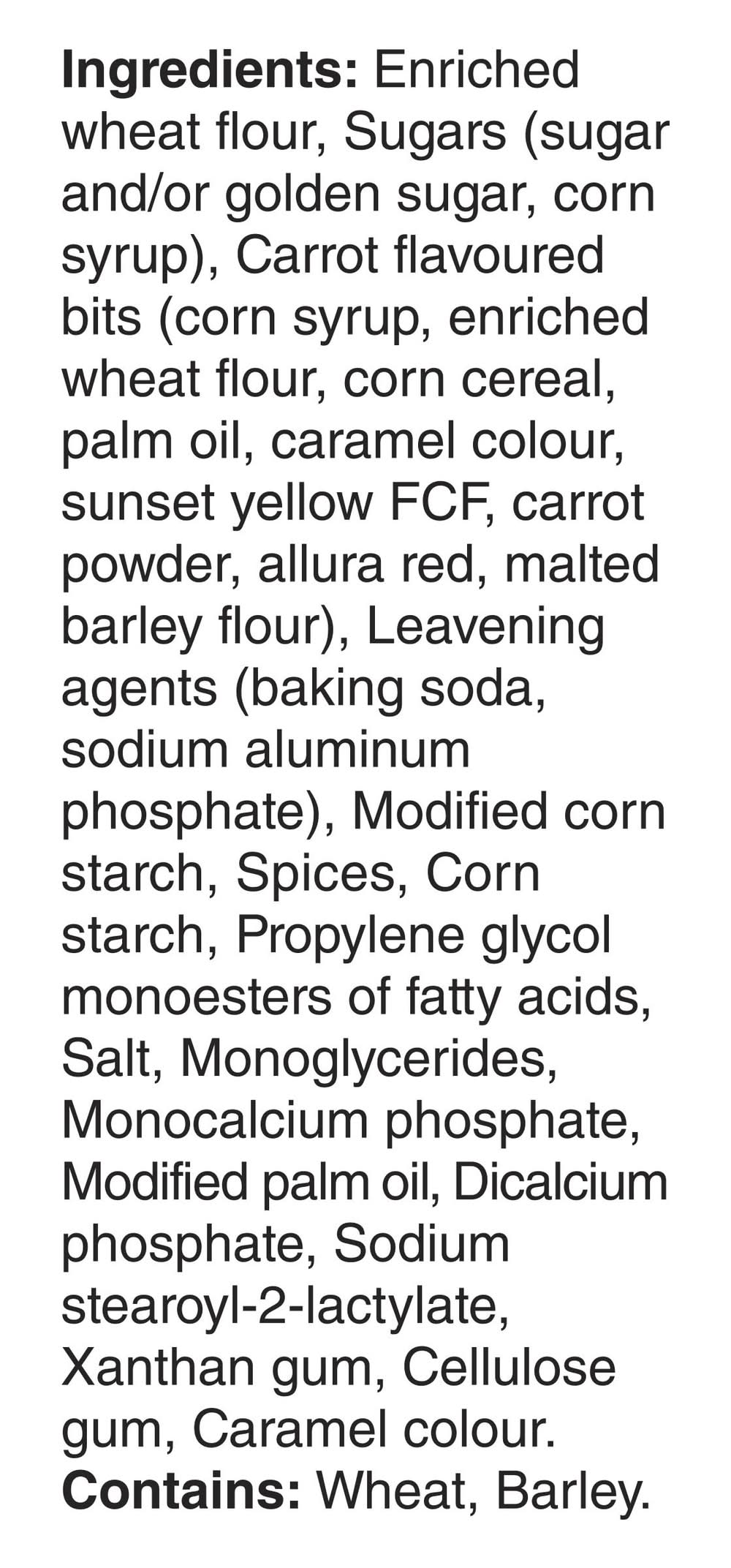 Ingredients: Enriched Wheat Flour, Sugars (Sugar And/Or Golden Sugar, Corn Syrup), Carrot Flavoured Bits (Corn Syrup, Enriched Wheat Flour, Corn Cereal, Palm Oil, Caramel Colour, Sunset Yellow Fcf, Carrot Powder, Allura Red, Malted Barley Flour), Leavening Agents (Baking Soda, Sodium Aluminum Phosphate), Modified Corn Starch, Spices, Corn Starch, Propylene Glycol Monoesters Of Fatty Acids, Salt, Monoglycerides, Monocalcium Phosphate, Modified Palm Oil, Dicalcium Phosphate, Sodium Stearoyl-2-Lactylate, Xanthan Gum, Cellulose Gum, Caramel Colour Contains: Barley and Barley Products, Wheat and Their Derivatives