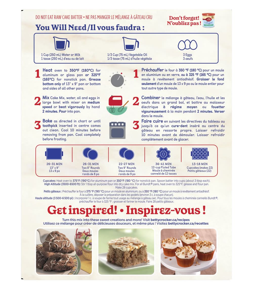 You will need: 1 cup water; 1/3 cup vegetable oil; 3 eggs. instructions: 1. heat oven to 350 degrees f for aluminum or glass pan or 325 degrees f for nonstick pan. grease bottom only of 13 inches x 9 inches pan or bottom and sides of all other pans. 2. mix cake mix, water, oil and eggs in large bowl with mixer on medium speed or beat vigorously by hand 2 minutes. pour into pan. 3. bake as directed in chart or until toothpick inserted in center comes out clean. cool 10 minutes before removing from pan. cool completely before frosting. pan size: 13 inches x 9 inches - 26-31 bake time (in minutes); pan size: two 8 inches rounds - 26-31 bake time (in minutes); pan size: two 9 inches rounds - 22-27 bake time (in minutes); pan size: bundt - 36-41 bake time (in minutes); pan size: cupcakes (makes 22) - 13-18 bake time (in minutes). for cupcakes: heat oven to 375 degrees f for aluminum pan or 350 degrees f for nonstick pan. spoon batter into cups (about 3 tbsp each). high altitude (3500-6500 ft): stir 1 tbsp all-purpose flour into dry cake mix. for all bundt pans, heat oven to 325 degrees f: grease and flour pan. make 28 cupcakes. do not eat raw cake batter.