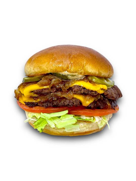 two 4 oz patties topped with caramelized onions, shredded lettuce, tomato, pickles, topped with our signature burger sauce.