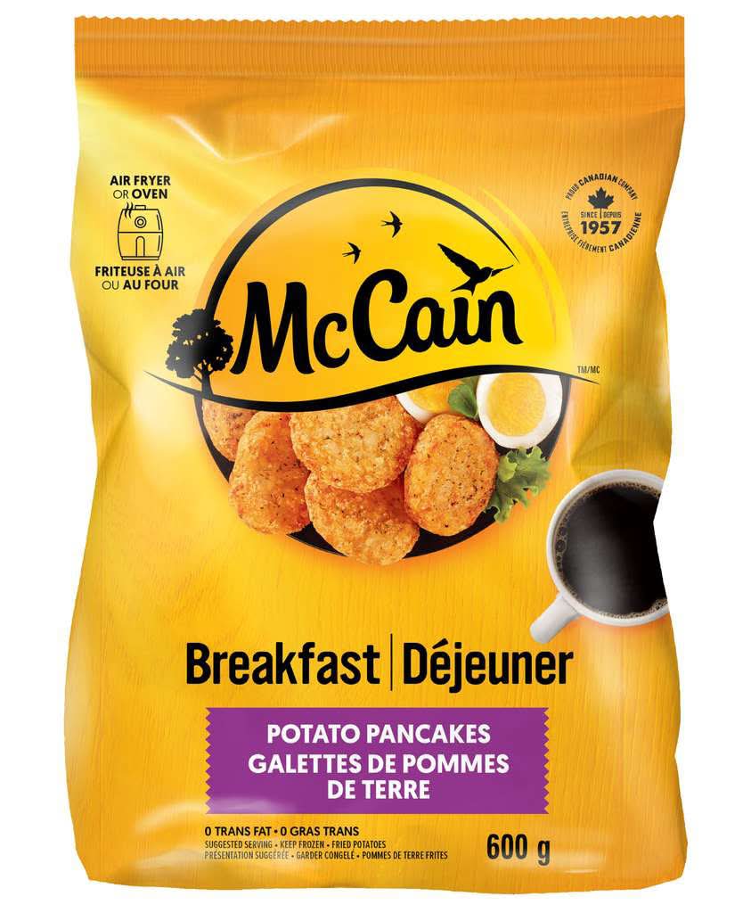 McCain Potato Pancakes bring everyone to the breakfast table with a tempting blend of real shredded potatoes and light seasoning. Perfect as a quick and delicious side dish, the secret ingredient in a special brunch recipe, or simply on their own, McCain potato pancakes cook up golden and crispy in your air fryer, on your stovetop, or in the oven. Lightly seasoned with onions and spices for a classic savoury flavor everyone will love, these quick potato pancakes cook up from frozen in as few as 9 minutes, depending on your method of preparation. Made with specially selected potatoes and simple ingredients, these easy potato pancakes contain no artificial flavors, hydrogenated oils, trans fat or cholesterol. Breakfast will never be the same once you add this classic potato dish to the menu. McCain Foods Canada, 8800 Main Street, Florenceville-Bristol, N.B. E7L 1B2