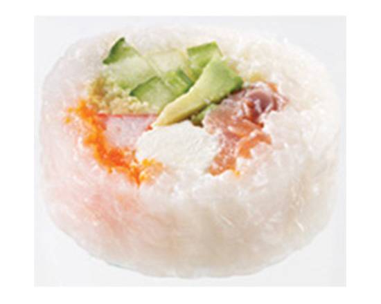Saumon fumé, imitation chair de crabe, avocat, concombre, tempura, masago, fromage à la crème, mayo épicée, feuille de riz et riz. / Smoked salmon, imitation crab meat, avocado, cucumber, tempura, masago, cream cheese, spicy mayo, rice paper and rice.