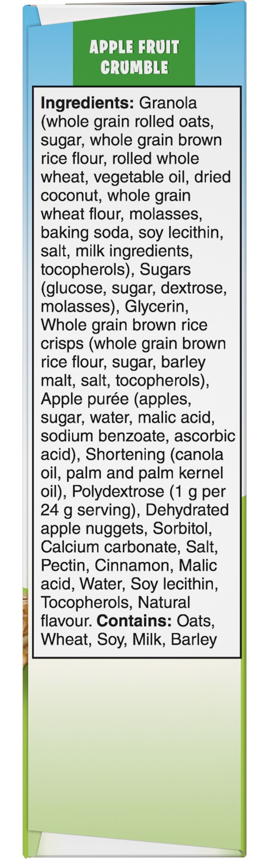 Ingredients: Granola (whole grain rolled oats, sugar, whole grain brown rice flour, rolled whole wheat, vegetable oil, dried coconut, whole grain wheat flour, molasses, baking soda, soy lecithin, salt, milk ingredients, tocopherols), Sugars (glucose, sugar, dextrose, molasses), Glycerin, Whole grain brown rice crisps (whole grain brown rice flour, sugar, barley malt, salt, tocopherols), Apple purée (apples, sugar, water, malic acid, sodium benzoate, ascorbic acid), Shortening (canola oil, palm and palm kernel oil), Polydextrose (1 g per 24 g serving), Dehydrated apple nuggets, Sorbitol, Calcium carbonate, Salt, Pectin, Cinnamon, Malic acid, Water, Soy lecithin, Tocopherols, Natural flavour. Contains: Oats, Wheat, Soy, Milk, Barley Contains: Contains Oat, Wheat, Soy, Milk, Barley Ingredients.