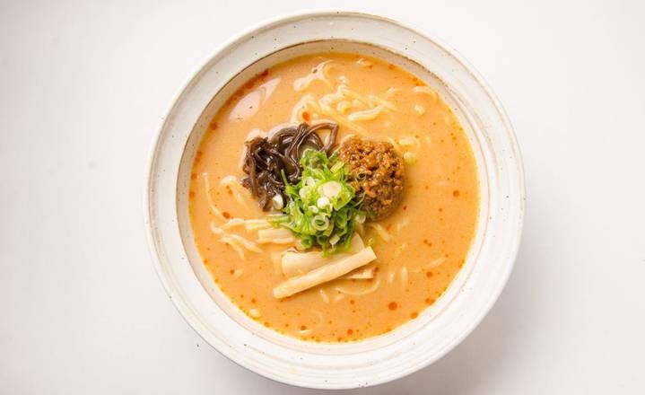 Isshin red miso blend, chili oil, bamboo shoots, wok fried ground tofu, green onions, wood ear mushrooms, and thick twisty noodles. Contains:Gluten, Sesame, Soy**ALERT; Thick noodle is boiled in same hot water as egg noodles.