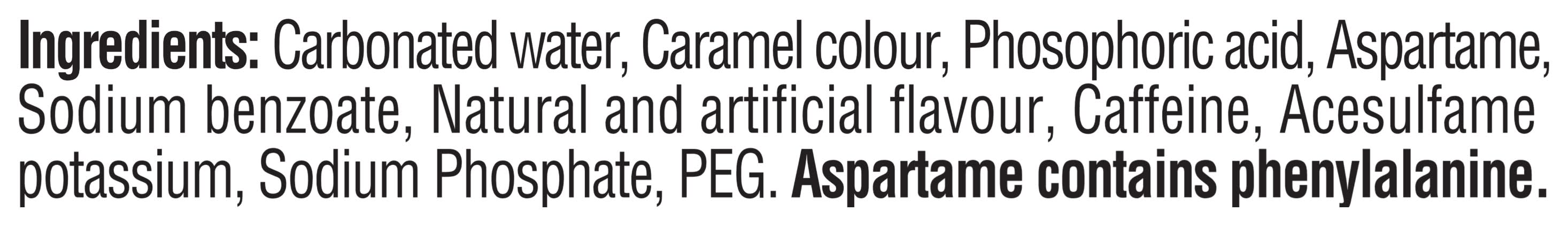 Ingredients: CARBONATED WATER, CARAMEL COLOUR, PHOSPHORIC ACID, ASPARTAME, SODIUM BENZOATE, CAFFEINE, ACESULFAME POTASSIUM, NATURAL AND ARTIFICIAL FLAVOUR, SODIUM PHOSPHATE, PEG. ASPARTAME CONTAINS PHENYLALANINE.