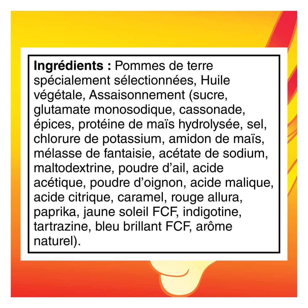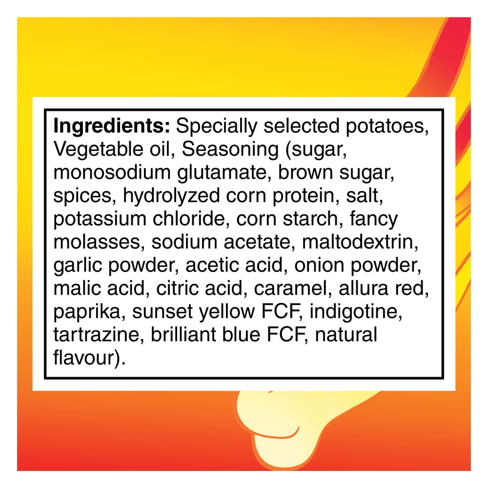 Ingredients: Specially Selected Potatoes, Vegetable Oil, Seasoning (Sugar, Monosodium Glutamate, Brown Sugar, Spices, Hydrolyzed Corn Protein, Salt, Potassium Chloride, Corn Starch, Fancy Molasses, Sodium Acetate, Maltodextrin, Garlic Powder, Acetic Acid, Onion Powder, Malic Acid, Citric Acid, Caramel, Allura Red, Paprika, Sunset Yellow Fcf, Indigotine, Tartrazine, Brilliant Blue Fcf, Natural Flavour)