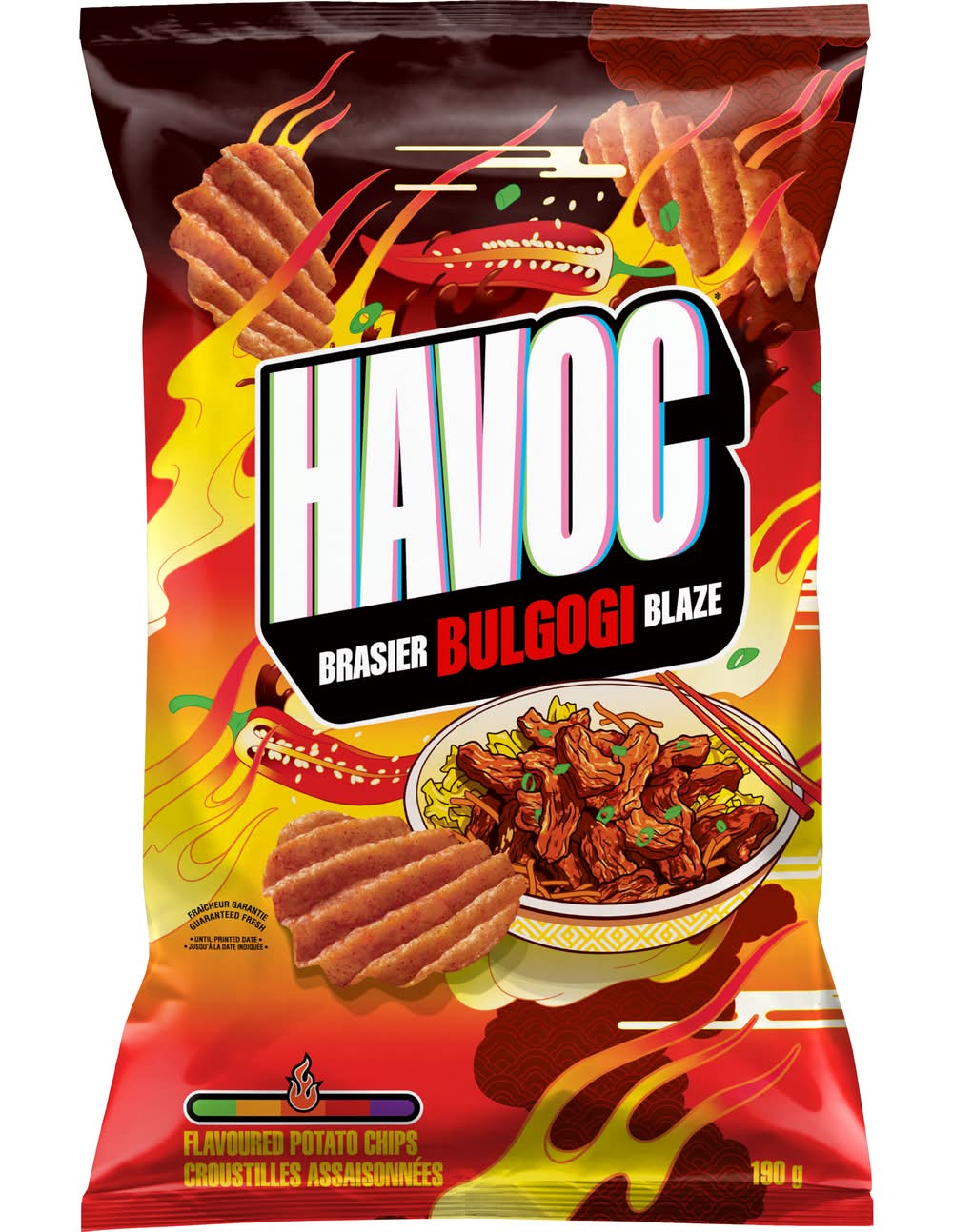 Crunch into an exotic mix of blazing intensity with every bite of Havoc Bulgogi Blaze flavoured potato chips! With a sweet and savoury blast of spicy crunch, these ridged potato chips are loaded with bold flavour. Wake up your taste buds with a snack that mixes hot and spicy with a touch of sweet for an unforgettable taste. Flavour: Bulgogi blaze