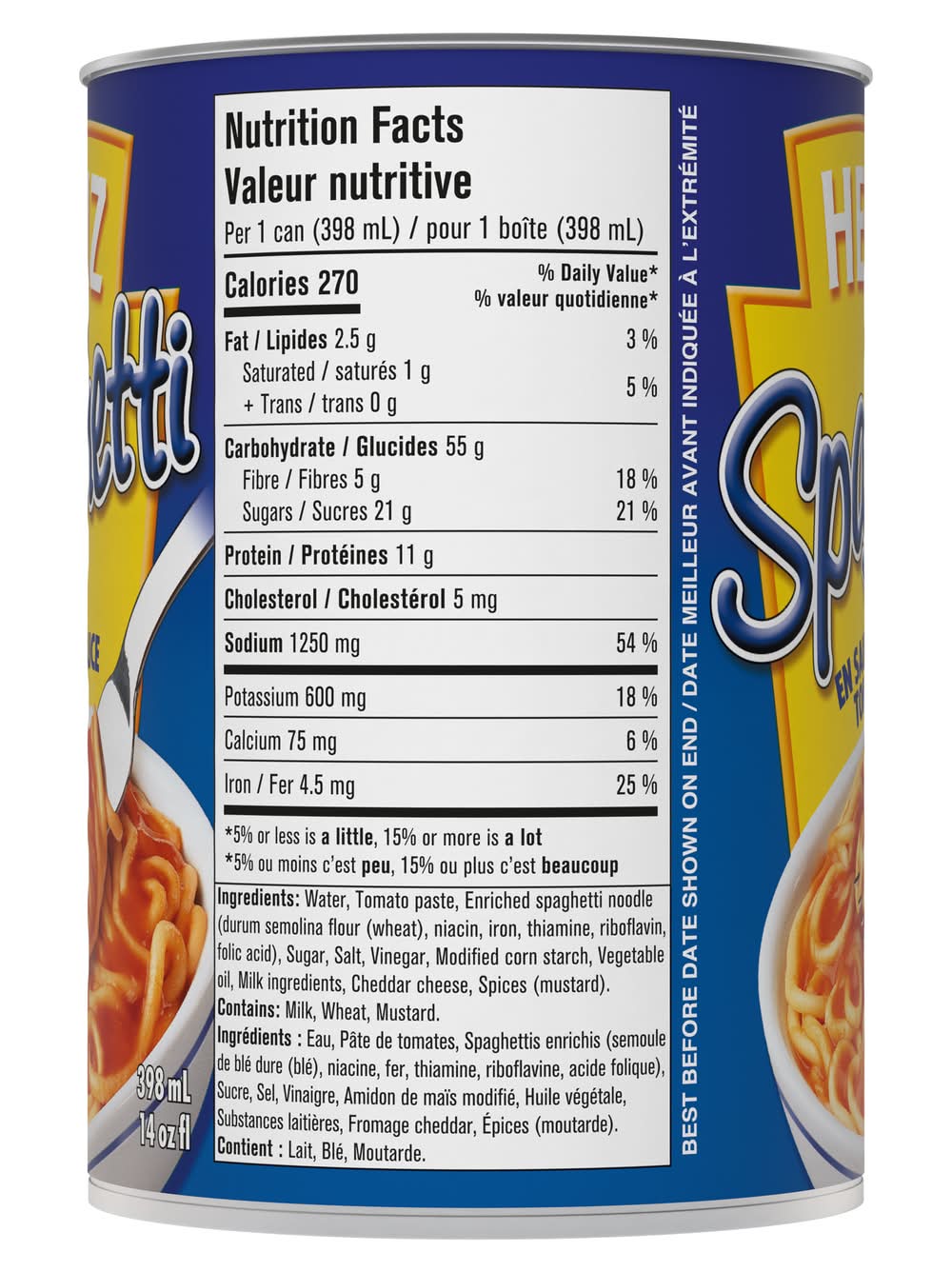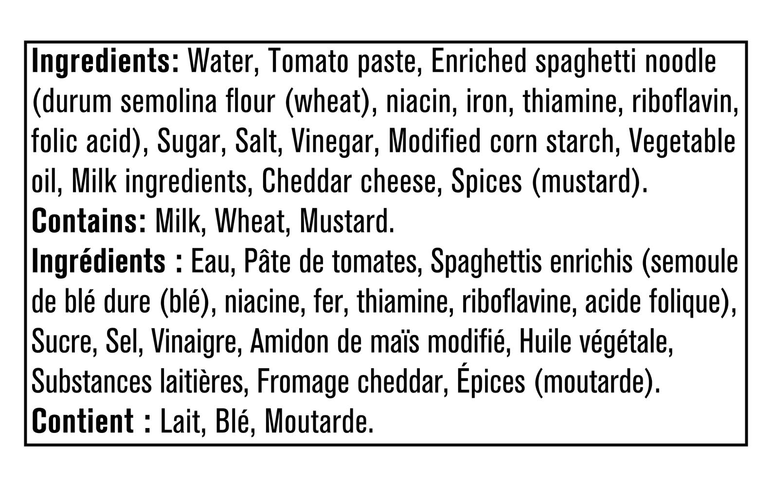 Ingredients: WATER, TOMATO PASTE, SPAGHETTI NOODLE (WHEAT), SUGAR, SALT, VINEGAR, MODIFIED CORN STARCH, VEGETABLE OIL, MILK INGREDIENTS, CHEDDAR CHEESE, SPICES (MUSTARD) Contains: Contains: Milk, Wheat, Mustard.