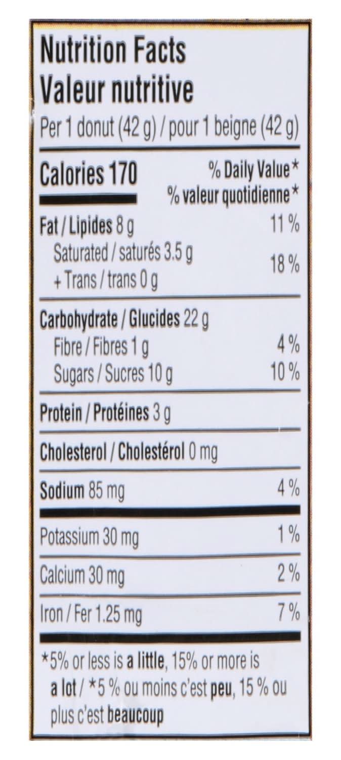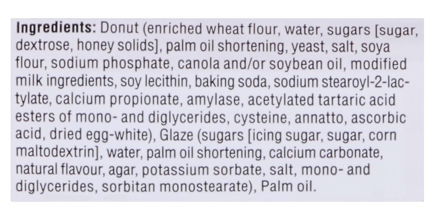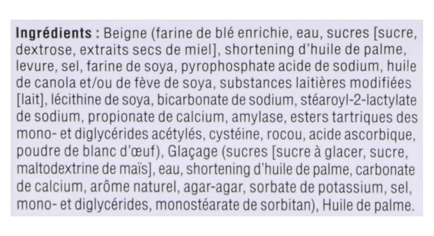 Ingredients: Beigne : farine de blé enrichie, eau, huile végétale (huile de palme, de canola et/ou de fève de soya), sucres (sucre, dextrose, extraits secs de miel), shortening d'huile de palme, levure, sel, farine de soya, pyrophosphate acide de sodium, substances laitières modifiées (lait), lécithine de soya, bicarbonate de sodium, stéaroyl-2-lactylate de sodium, propionate de calcium, amylase, esters tartriques des mono- et diglycérides acétylés, cystéine, rocou, acide ascorbique, poudre de blanc d'œuf. Glaçage : sucres (sucre à glacer, sucre, maltodextrine de maïs), eau, shortening d'huile de palme, carbonate de calcium, arôme naturel, agar-agar, sorbate de potassium, sel, mono- et diglycérides, monostéarate de sorbitan. Contains: Fabriqué dans une usine sans arachides