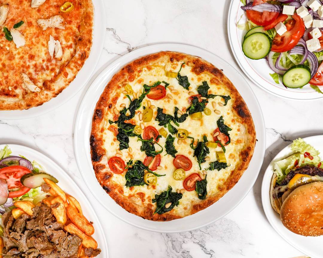 Alle Salate werden mit Eisbergsalat, Tomaten, Zwiebeln, Gurken, Mais, Pilzen, Paprika, Feta und Dönersauce und einen Schärfegrad deiner Wahl zubereitung und dazu frisch gebackenes Brot serviert.Pizza
