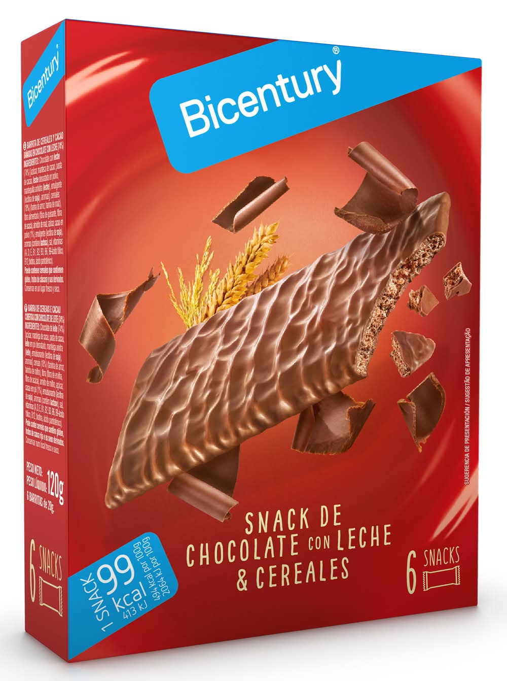 Barritas de cereales y cacao bañadas en chocolate con leche · Bicentury (6 x 20 g)