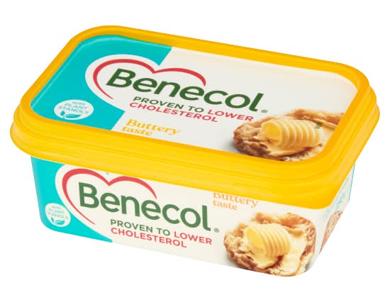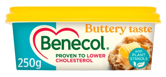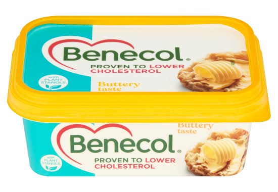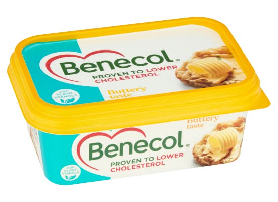 This Benecol® spread contains plant stanols shown to lower cholesterol. By enjoying 3 servings of 10g daily you can lower your cholesterol in 2-3 weeks. • Benecol Limited, Benecol Limited, The Mille, 1000 Great West Road, Brentford, London, TW8 9DW. • Packaging: Reusable