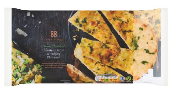 Quality you can taste This delicious hand-stretched flatbread is topped with fragrant extra virgin olive oil and a delicate roasted garlic and fresh parsley dressing. Co-op (GB) / Co-op (NI),