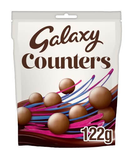 Galaxy Counters Chocolate Pouch Bag offers smooth and creamy milk chocolate pieces designed to melt delightfully in the mouth. Each pouch contains 122 grams of chocolate pleasure, crafted with care. Mars Wrigley Confectionery UK Ltd,