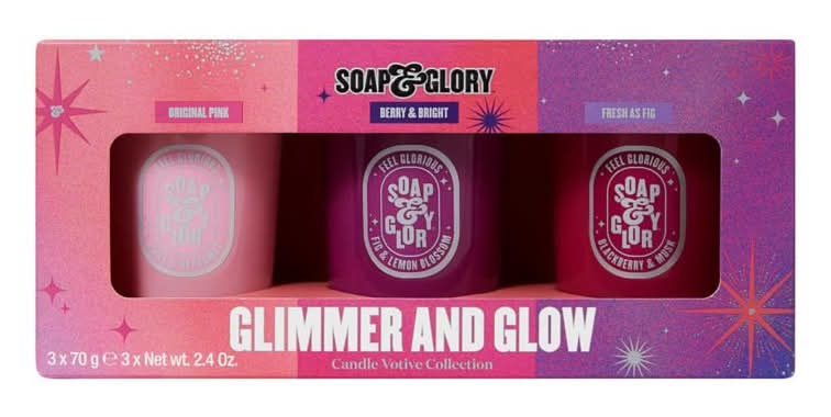 Soap & Glory Original Pink-Fig & Lemon Blossom-Blackberry & Musk, Glimmer & Glow Votive Candle Trio Gift Set (3 pack)