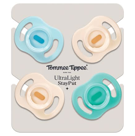 Tommee Tippee 0-6 Months, Blue-Green-Sand, Ultra Light Stayput Day & Night Soothers (4 pack)