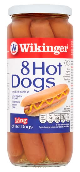 Beechwood smoked Hot Dogs made with mechanically separated Turkey and chicken meat with pork and packed in brine. Smoked, skinless King of hot dogs • Wikinger Fleischwaren Gmbh, 24937 Flensburg, Germany. • Packaging: Reusable