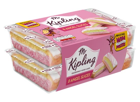 Mr Kipling Angel Cake Slices consists of layers of pink and Yellow Sponge with a vanilla-flavored filling making up 12% of the product. It is topped with 26% decorated fondant icing. Exceedingly Good Cakes, 100% Natural Flavors & No Artificial Colors, No Hydrogenated Fat. • Flavour: Vanilla • Premier Foods ROI, PO Box No 13008,Dublin 1 • Packaging: Reusable