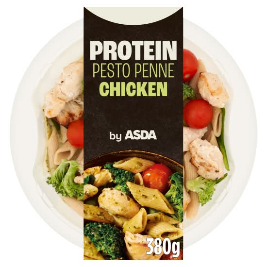 Roasted chicken breast with cherry tomatoes, broccoli and baby spinach in a creamy basil pesto sauce, with wholewheat penne Protein contributes to the maintenance of muscle mass. • Asda, Leeds, Ls11 5ad. • Packaging: Reusable